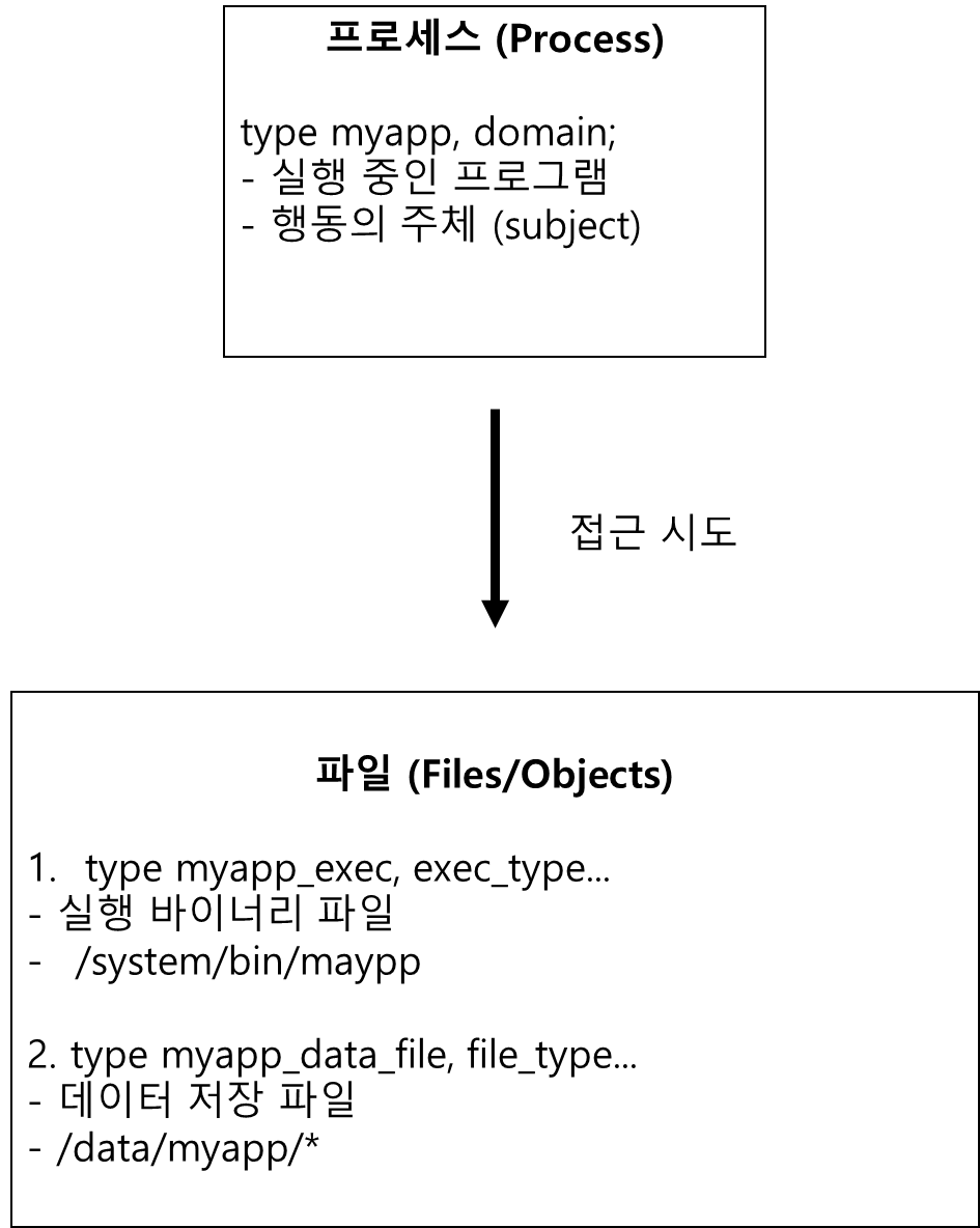 - myapp (domain) = 프로세스가 실행되는 보안 컨텍스트