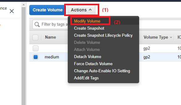 그 후에 Action을 클릭하고 Modify Volume 버튼을 클릭하여 볼륨 수정을 한다.