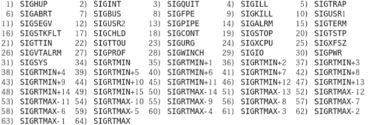 53) SIGRTMAX-11 54) SIGRTMAX-10 55) SIGRTMAX-9 56) SIGRTMAX-8 57) SIGRTMAX-7