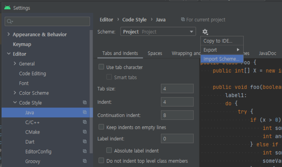 File > Settings > Code Style (ctrl + Alt+ s 후 code style 검색) > Java 클릭 후에 톱니바퀴 클릭하여 import Scheme.. 클릭하여 xml 선택 후 적용.