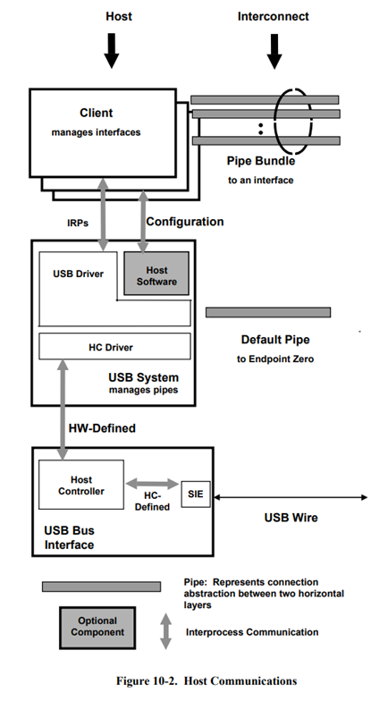 USB 드라이버 (USBD)는 클라이언트들을 위해서, USB 디바이스들에게, Basic Host Interface (USBDI)를 제공합니다. 그 인터페이스는 HCD와 USBD사이에 있는데, 이건 Host Controller Driver Interface (HCDI)로 알려져 있습니다.